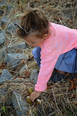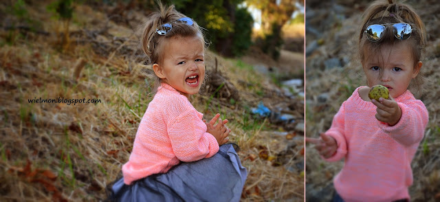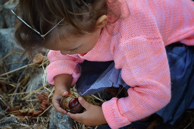 A dopóki Marysia nie przekonała się, że to fajne brązowe „kamyki” ukryte w skorupce, jej pierwsza reakcja na spadające z drzewa 'kulki’ wyglądała tak 🙂